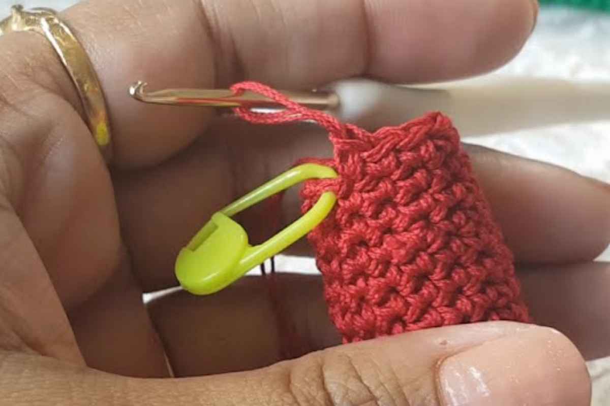 - Begin with a magic ring using red yarn. Crochet six single crochets into the ring and pull tight to close.