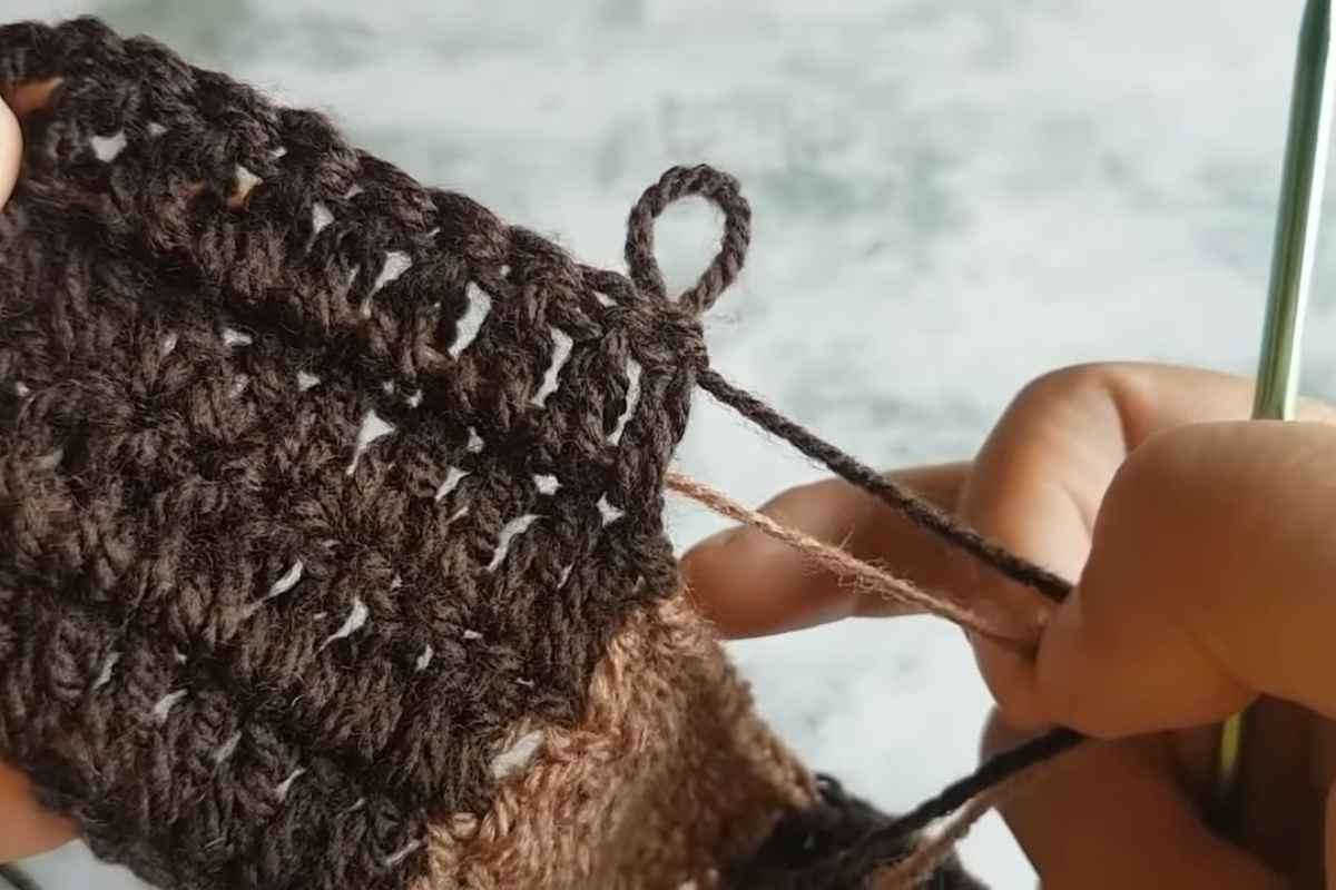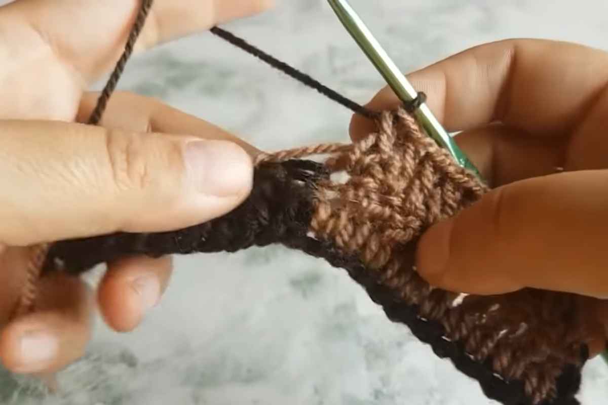 - Alternate colors every three stitches across each row, maintaining a consistent pattern. For each row, you will switch the color blocks, creating a checkered effect. Carry the unused yarn along the row and crochet over it to keep the fabric smooth and minimize loose ends.